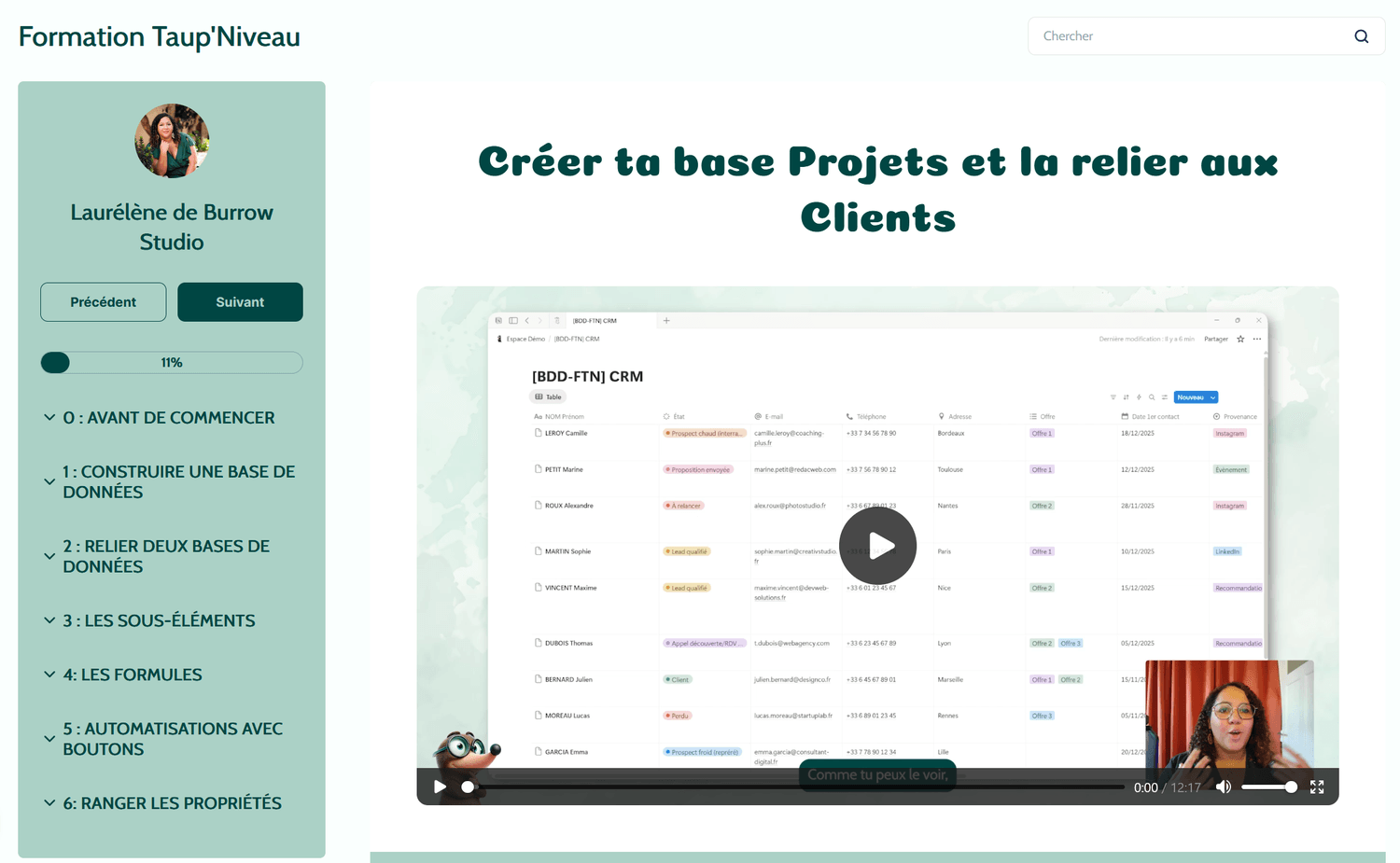 Tout le contenu vidéo est accessible sur systeme.io (tu avances à ton rythme).